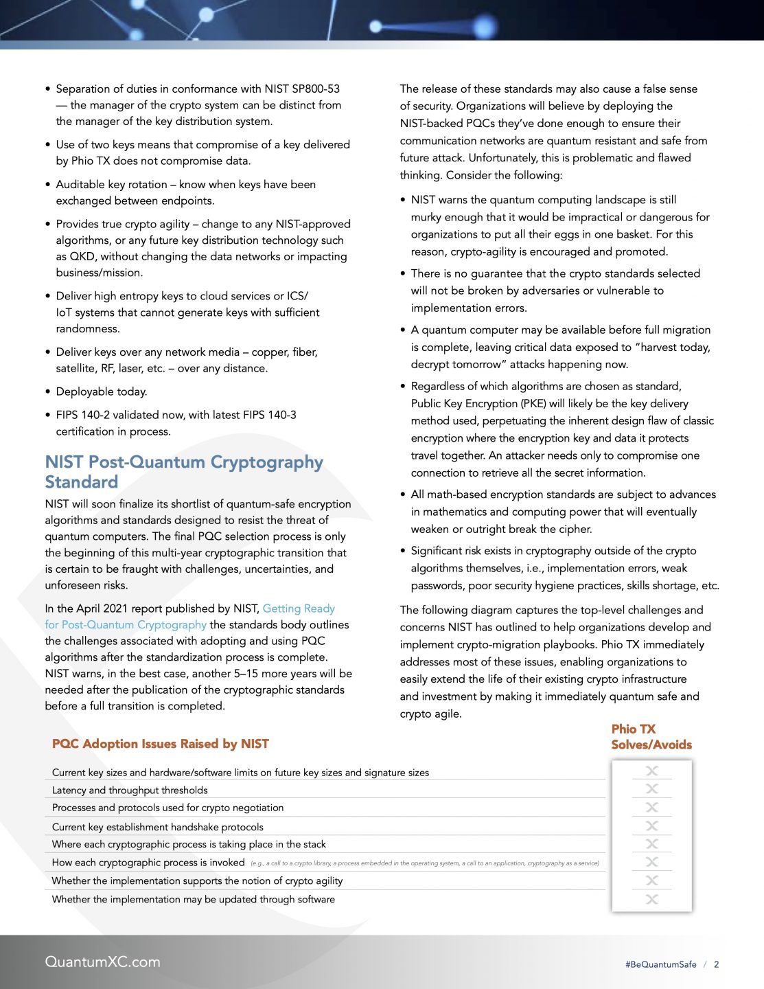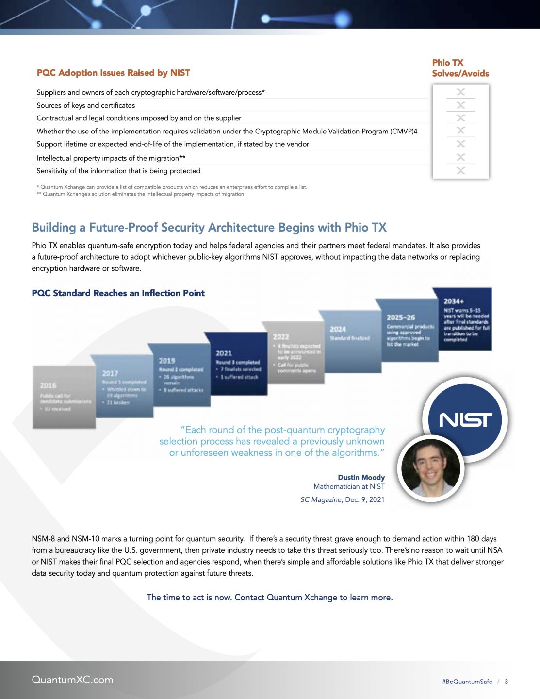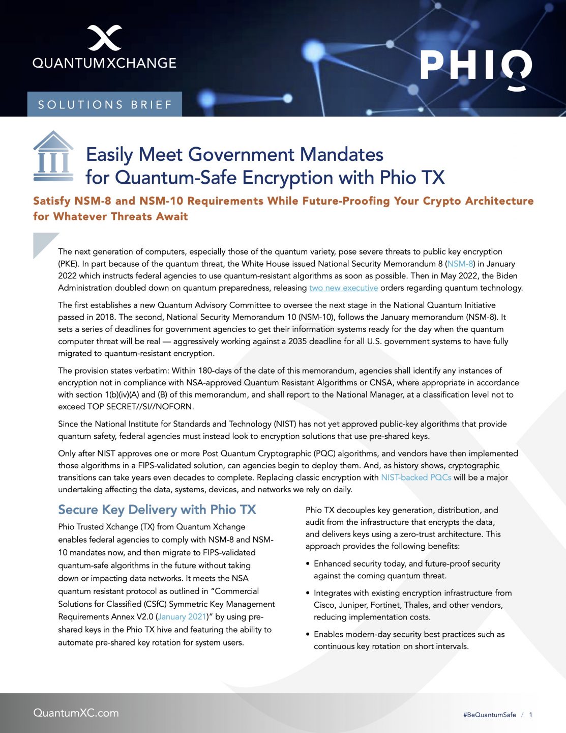 Learn how Quantum Xchange’s FIPS-validated solution, Phio TX enables quantum-safe encryption today and helps federal agencies and their partners meet NSM-8 mandates easily and affordably. It also provides a future-proof architecture to adopt whichever public-key algorithms NIST approves, without impacting the data networks or replacing encryption hardware or software.